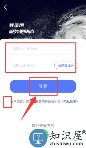 1、在看天App登录页填写手机号及验证码,完成登录。