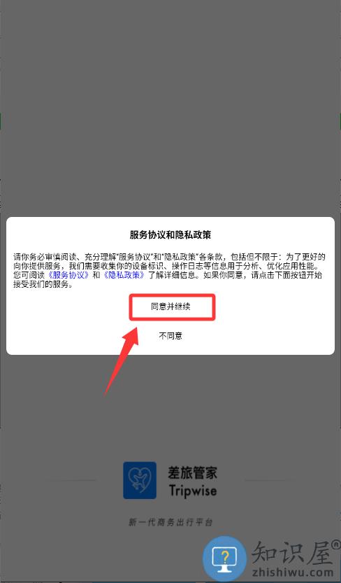 1、在差旅管家中点击"同意并继续",进入登录操作界面。