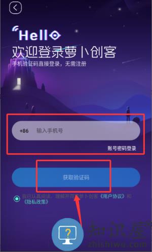 1、在萝卜创客中点击"同意"用户协议,进入手机号登录界面。
