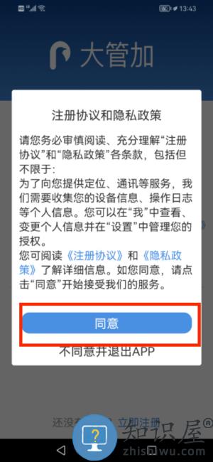 1、启动大管加应用,查阅注册协议与隐私政策后点选同意。