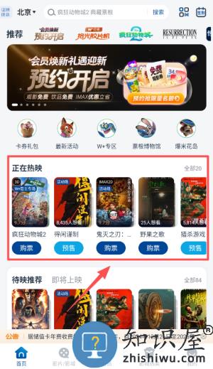 1、首先下载并注册账号,登录后软件会显示你所在城市的影城与当前热映影片。