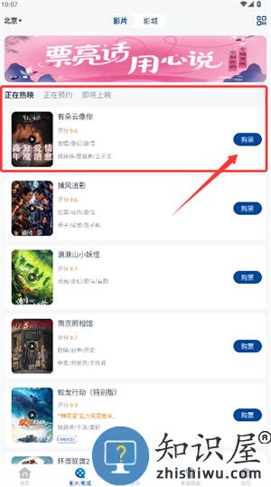 然后第二步。选择完成后,开始购票,这里每天都会更新新的信息,如果当前热映中有你感兴趣的电影,选择“购票”。根据事件、地点进行选择。