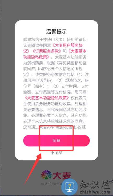 1、在大麦APP中点击"同意"温馨提示,进入应用首页。