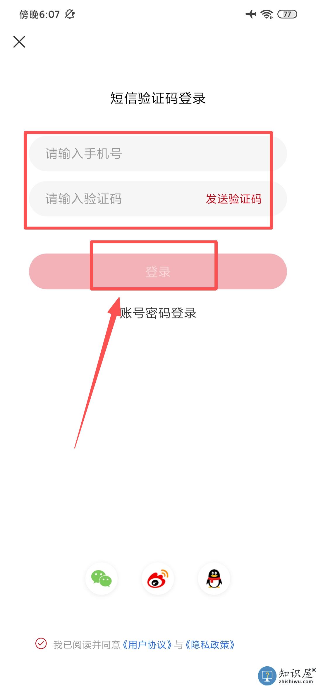 1、在服务协议弹窗中点击"同意",进入短信验证码登录页面。