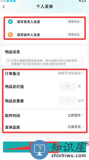 3、在发单页填写收发人及物品信息,确认后提交申请。