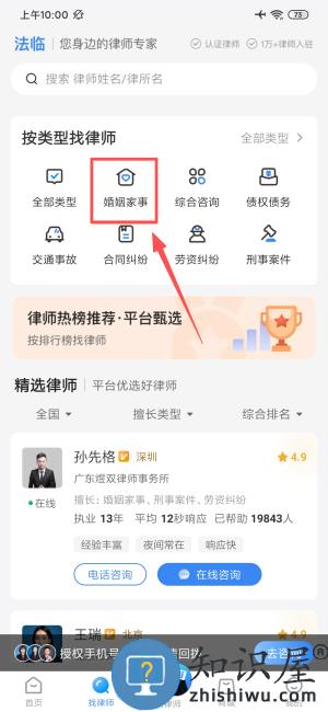 1、于找律师页面选择婚姻家事分类,进入对应的律师列表界面。