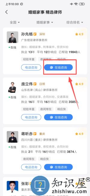 2、在列表中选定目标律师,点击其在线咨询进入沟通页面。