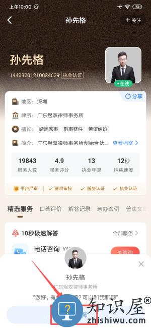 3、在律师详情页点击私聊按钮,即可开始一对一咨询对话。