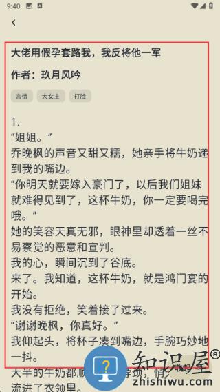 4、进入书籍详情页,浏览正文内容,开始阅读言情小说。