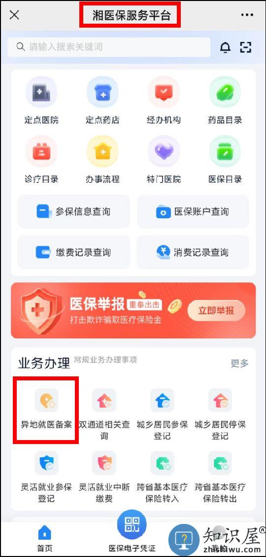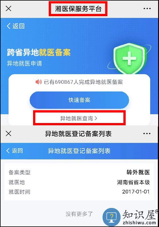 步骤:进入“湘医保”→“服务平台”→“登录平台”→“异地就医”→“异地就医查询”(位于“快速备案”下面)。