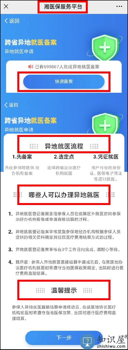第三步:点击【快速备案】按钮,认真阅读异地就医流程、异地就医相关知识等温馨提示内容,然后点击【下一步】;