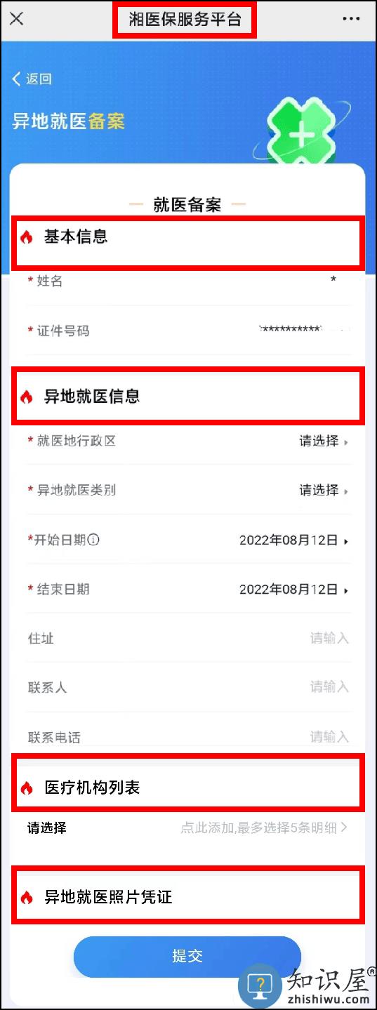 进入备案页面后,确认基本信息(姓名、证件号码),填写异地就医信息(就医地行政区、异地就医类别、开始日期、结束日期等),添加就医的医疗机构(最多5家),上传有关资料凭证,最后点击“提交”即完成备案程序;