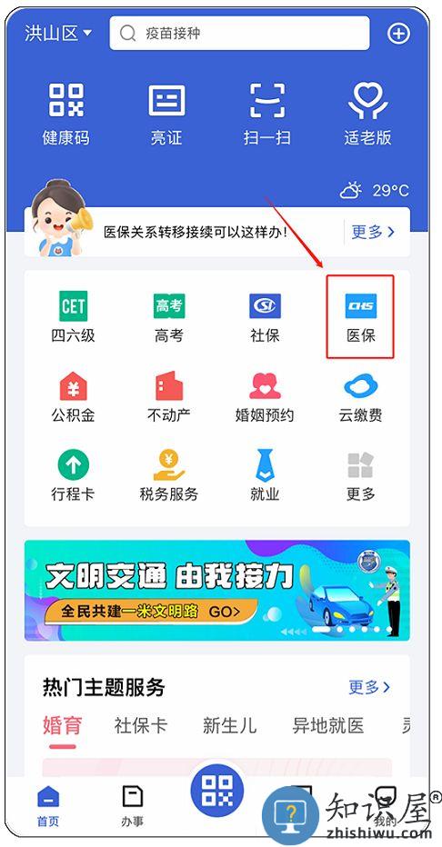 1、第一步:打开鄂汇办APP进入首页,点击“医保”;