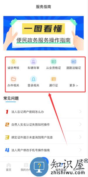 3、服务指南板块对核心业务进行了分类引导,包括车辆管理事项从业资格证相关业务办事流程说明及登录问题帮助。