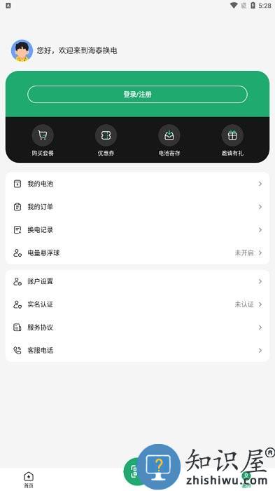 点击首页下方我的按钮,如图所示,您好,欢迎来到海泰换电,点击登录/注册