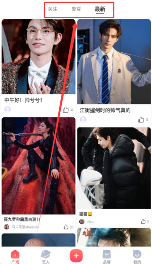 2、广场板块提供了关注用户动态更新明星偶像资讯及平台最新内容推送三种信息浏览模式。