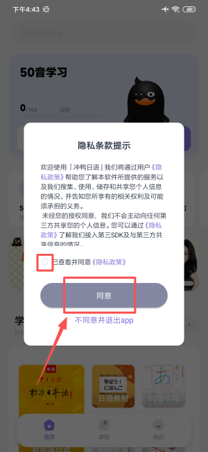 1、于隐私条款弹窗中勾选协议并点击同意,随后进入登录或注册页面。
