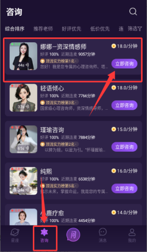 3、登录后进入咨询页面,选择咨询师点击立即咨询。