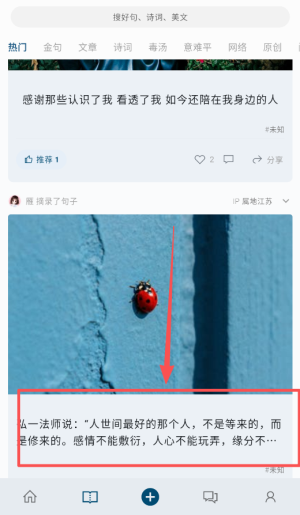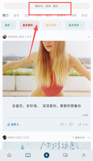 1、下载后打开句摘App 可以先浏览首页推荐的海量优美文案 长短内容都有 看到喜欢的句子直接点击就能收藏到自己的摘抄本里。