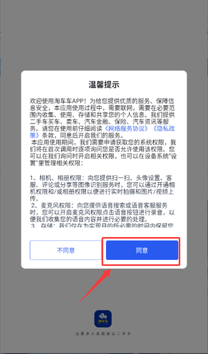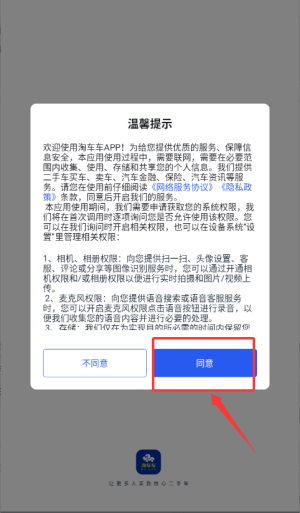 1、启动淘车车应用,在提示页面点击同意接受相关协议条款。