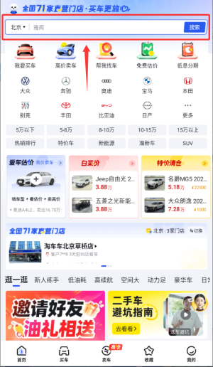 1、在应用商店下载淘车车app,注册账号并登录,可在首页浏览或搜索二手车源。