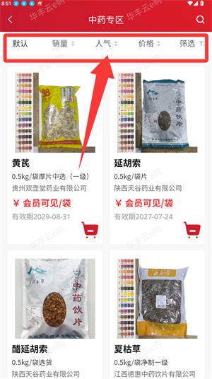 4、可根据销量或人气等条件筛选,查看具体药材详情。