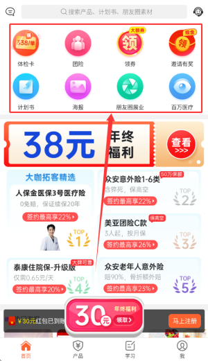 3、首页提供了保险体验卡领取、团体保险业务、保险计划书生成、营销海报工具及百万医疗保险产品等核心服务入口。