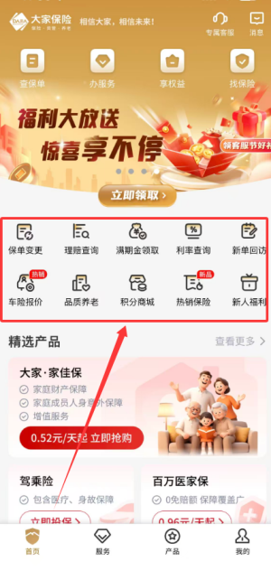 3、首页提供了保单信息查询、在线业务办理、会员权益查看及保险产品选购四大核心功能模块入口。