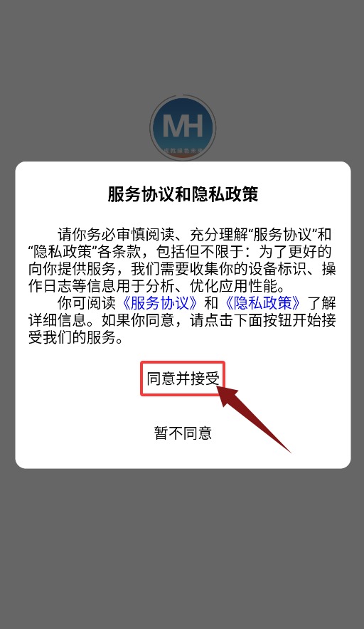1、首次启动应用需点击同意并接受,确认后方可进入登录界面。