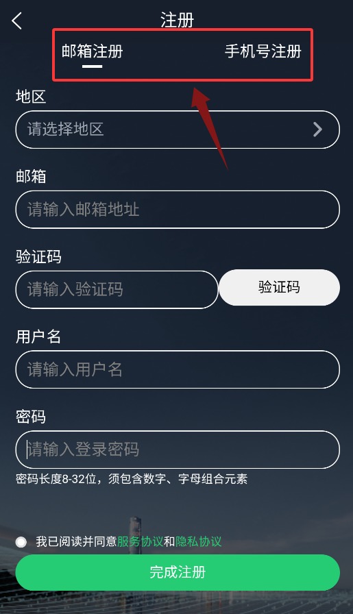 3、注册时可选择邮箱或手机号,填写地区、验证码、用户名与密码。