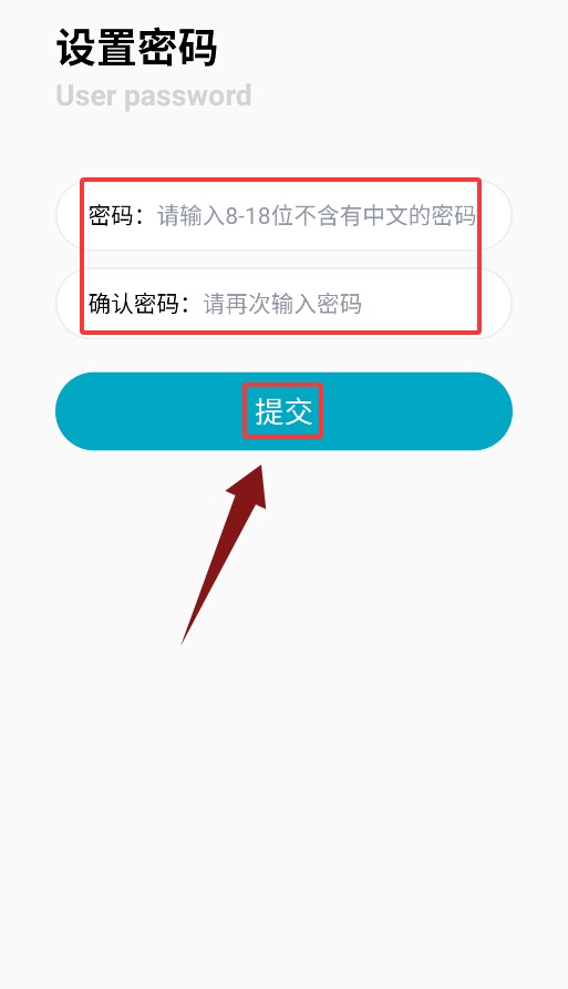 4、设置密码时输入8-18位不含中文的密码,确认后提交完成注册。