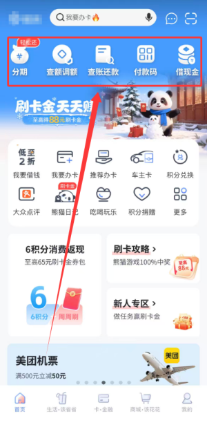 3、首页提供了消费分期办理、信用额度差额调整、账单查询与还款、付款码生成及现金借款申请等核心金融服务。