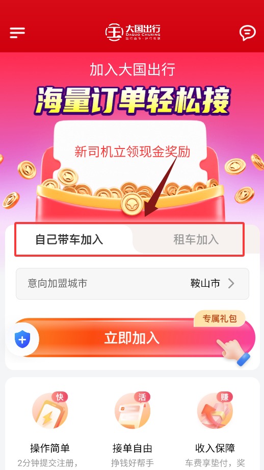 2、可选择“自带车加入”或“租车加入”两种合作模式。