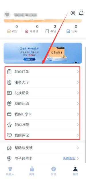 4、个人中心包含订单管理、服务大厅、兑换记录、活动参与及收藏内容。
