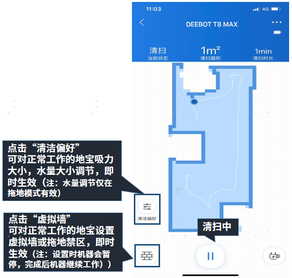 机器在工作过程中,点击APP左下角“虚拟墙"或“清洁偏好”图标均可进行设定。