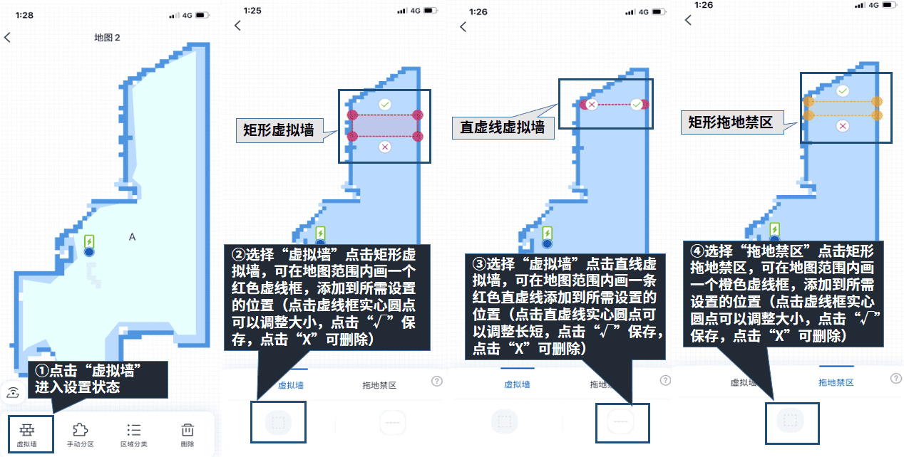 (根据需要,在地图范围内手动画“虚拟墙”/“拖地禁区”,调整完毕后点击“√”保存;若要删除或编辑已设定好的虚拟墙/拖地禁区,点击已画好的虚拟墙/拖地禁区后,进行删除或编辑。)
