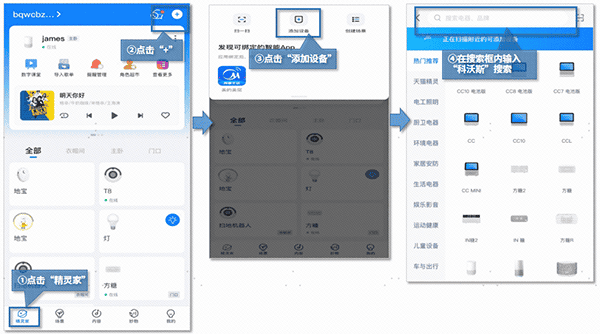 (2)打开天猫精灵APP,进入“精灵家”,确认智能音响设备在线, 点击右上角“+”选择“添加设备”;