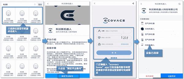 (3)在搜索框内输入“科沃斯”选择任意型号进入,点击绑定平台“科沃斯扫地机器人”>登录“ecovacs home”账号完成绑定。