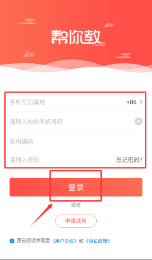 3、在登录页填写手机号机构编码密码,勾选协议点击登录。