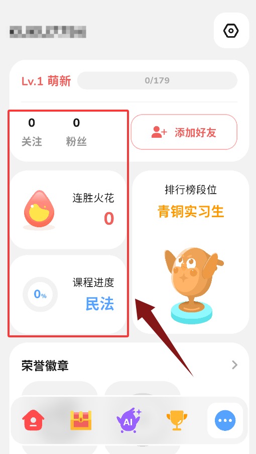 3、我的界面支持查看关注、粉丝、连胜记录与课程进度。