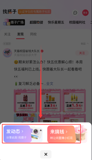 4、点击加号图标可发布个人动态内容,并进入兼职或赚钱任务相关栏目。