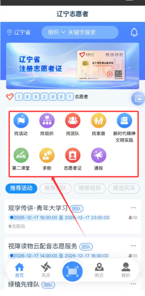 3、首页提供活动查找、组织查询、团队检索、家庭匹配、第二课堂参与、求助发布及志愿者证管理入口。