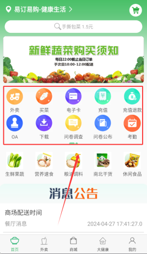 3、首页整合了外卖点餐、生鲜采购、电子卡券、话费充值及考勤管理等常用服务。