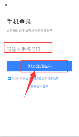 2、在登录页填写手机号码并获取短信验证码,收到后填入完成。