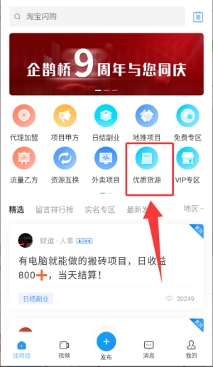 3、登录后进入首页找到优质货源选项,点击查看相关资源。