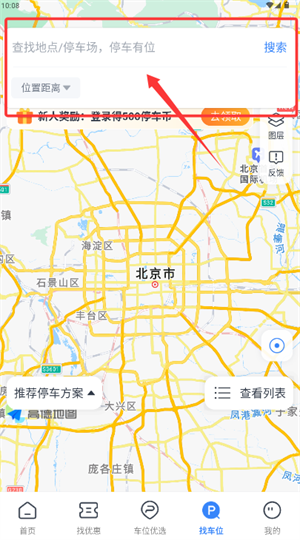 3、在找车位页面搜索框输入目标地点,可快速查找可用停车场信息。