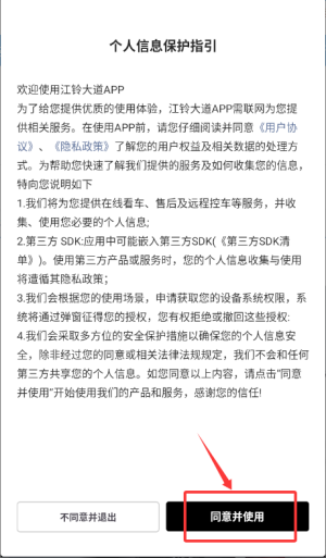 2、启动江铃大道应用,于个人信息保护指引页面点选“同意并使用”。