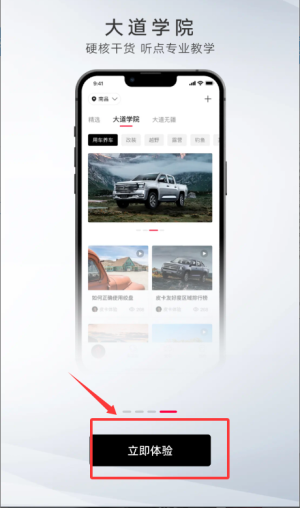 3、浏览引导页的大道学院介绍后,点击“立即体验”进入功能页。