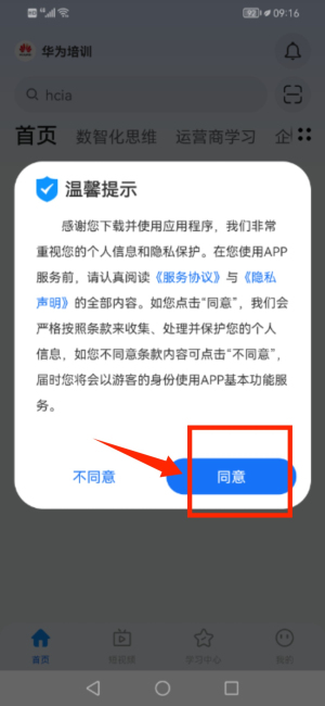 2、启动华为培训应用,先在温馨提示页面点击同意按钮确认协议。