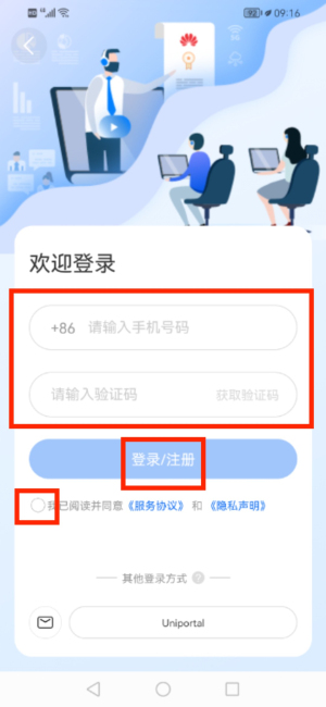 3、登录界面输入手机号及验证码,勾选协议后点击登录注册。